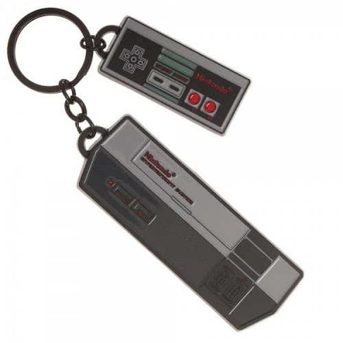 The original, and still the best, the NES, is represented in miniature on this Nintendo Controller Charm Key. A small NES unit and even smaller controller, incredibly designed down to the last detail, hang from a black-toned metal D-ring keyring. Ah, memories.