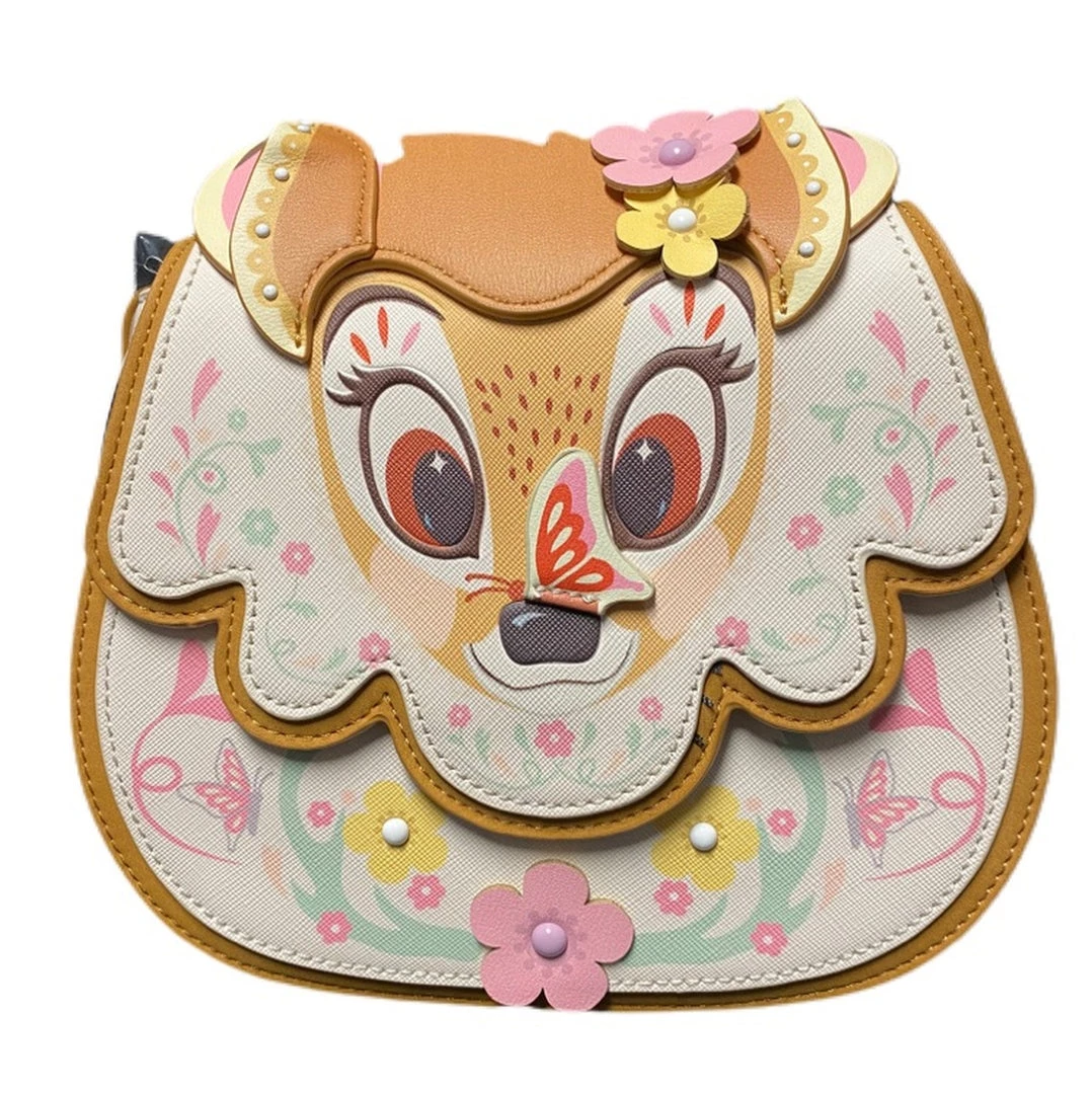 Bring a floral touch to any of your outfits with this Disney crossbody bag from Danielle Nicole! Inspired by the animated classic, Bambi, the eponymous animal friend lends his look to this bag’s figural appliqué, smiling as he greets a butterfly friend on the front bag flap. Decorated by beaded flower appliqués and other floral details, the gold-toned hardware, die-cut brand badge, and adjustable shoulder straps make this bag an easy-carry style to bring some springtime fashion to your look. Also features an embossed Danielle Nicole logo on the back.