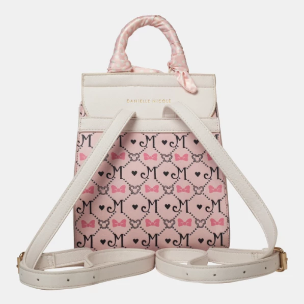 The classic backpack that will never go out of style, featuring the most stylish mouse of all! We created a custom monogram print with the “M,” bow, and hidden mickey details to give this piece an elevated design. The front flap features Minnie herself putting on her finishing touch: an adorable big bow! Utilizing a fun mix of materials such as velvet, silver and pink metallic and embroidery accents, this backpack is feminine and sweet. The bag has adjustable straps, a back wall zip pocket and interior front pocket. Finished with a polka dot scarf wrapped handle, this modern piece is a collector’s item you’ll be able to style in your everyday life.