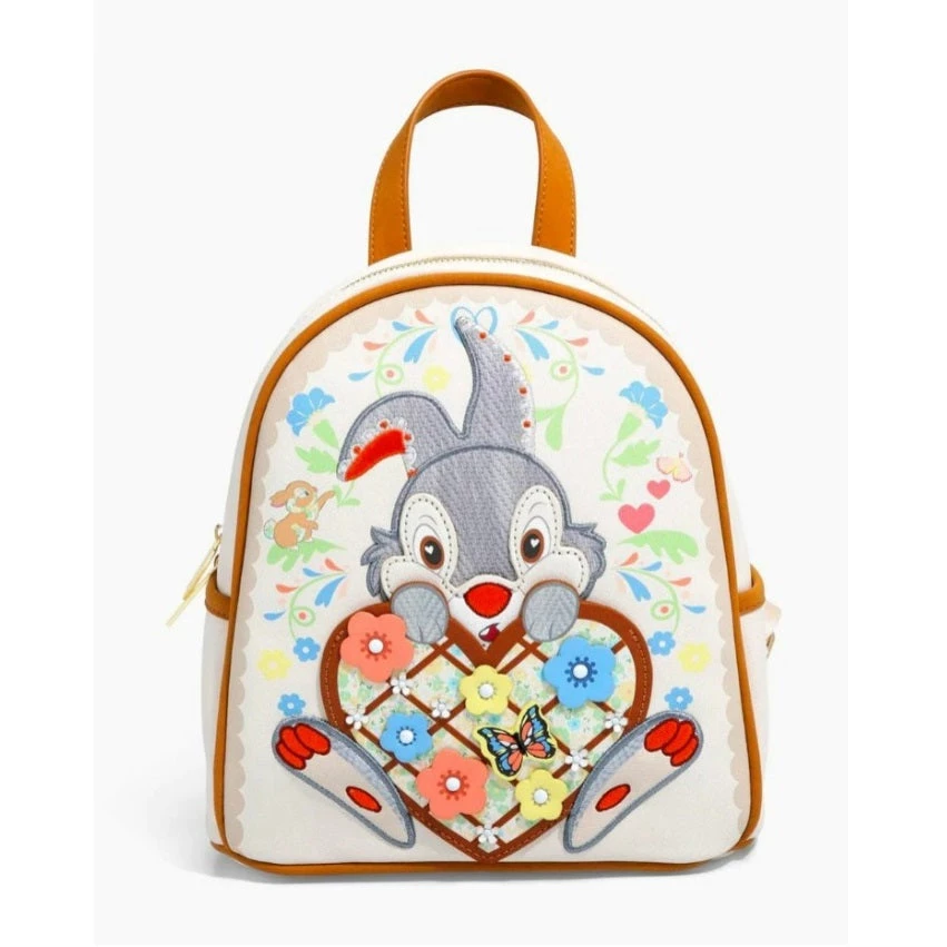 Add a touch of Disney charm to your next adventure with a little help from this adorable Bambi mini backpack from Danielle Nicole! With a stunning intricately layered portrait of Thumper behind a heart applique, the front design dons embroidered detailing and beaded flowers for a look straight out of the whimsical woods. This mini backpack also features gold-toned hardware, adjustable shoulder straps, and interior pockets.