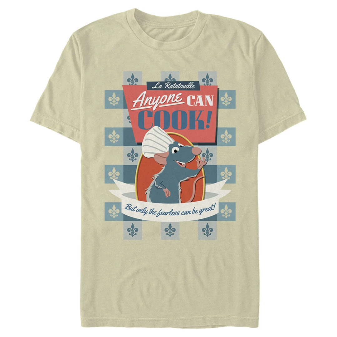 Anyone can cook, but only the fearless can be great! So, go ahead and be great with this Pixar Ratatouille Men’s T-Shirt! Head to dinner at Auguste Gusteau’s restaurant with Remy the rat, Colette, Linguini, Ego and more! Remy knows good food (and good fashion) and he can’t wait to try a taste of this Ratatouille design.