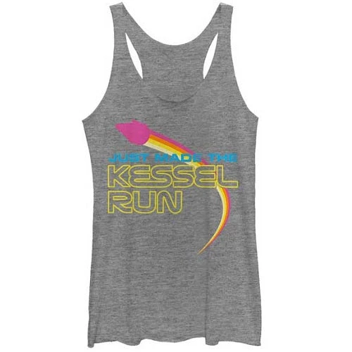 Only the best pilot in the galaxy can make the Kessel run and pull off the style of the cool Solo: A Star Wars Story Made the Kessel Run Rainbow Juniors Racerback Tank. The Millennium Falcon dashes across this Star Wars shirt with a rainbow of colors trailing it and “Just Made the Kessel Run” printed across the front.