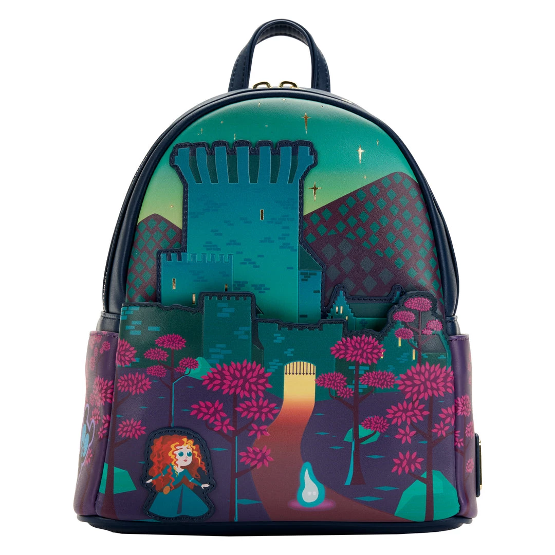 Feast your eyes on the Brave Princess Merida Castle Mini Backpack. As Merida questions whether she can change her fate, she encounters a mysterious will-o’-the-whisp in the forest outside her kingdom. When the daylight fades, the will-o’-the-whisp glows in the dark to illuminate her path. Turn the bag around to find a touching scene of Merida reuniting with her mother in bear-form. This beautifully detailed mini backpack has room for all your adventure essentials and is destined to join your Disney-Pixar Loungefly collection.