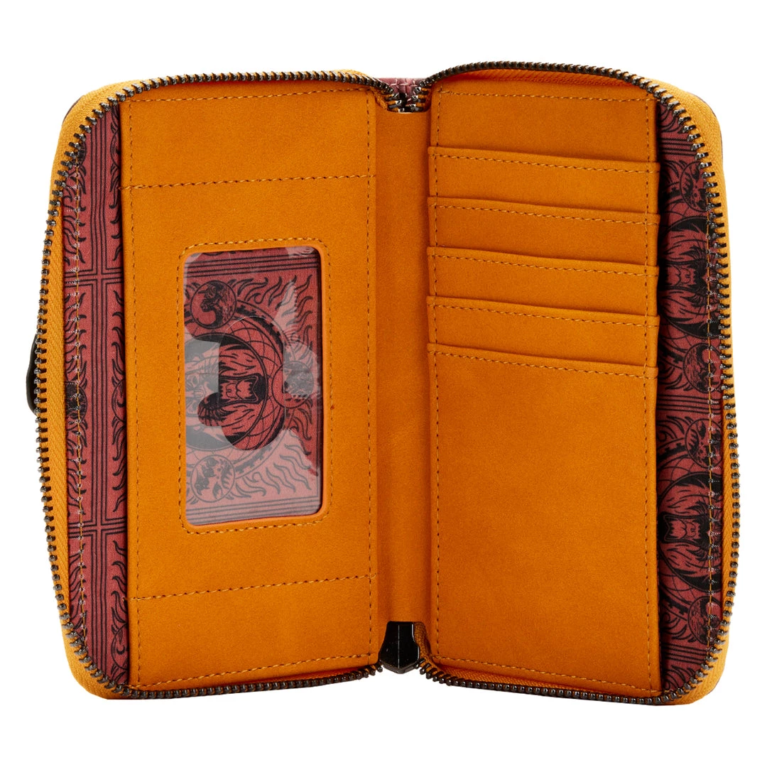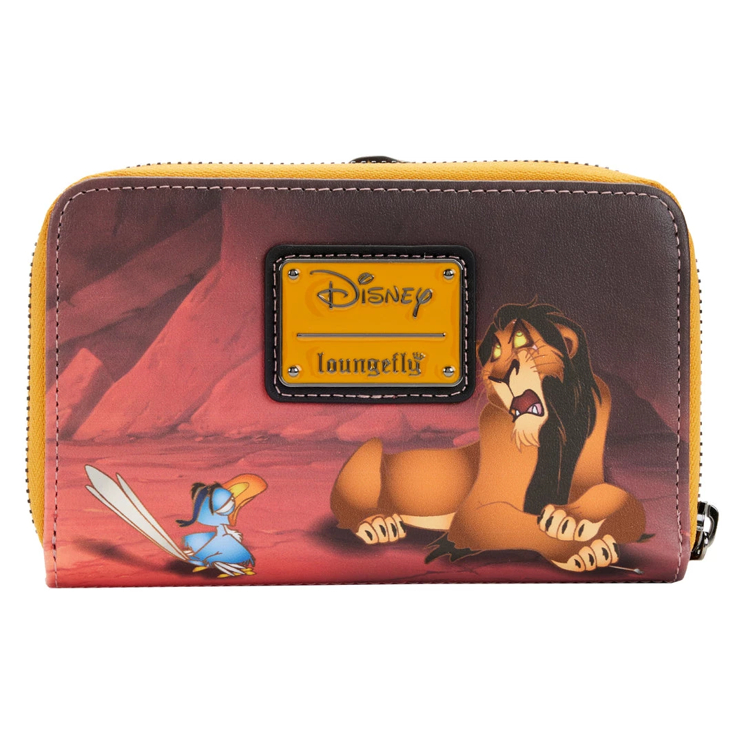 The Loungefly Lion King Villains Scene Scar Zip Around Wallet is made of vegan leather (polyurethane). Wallet zips closed and has sturdy metal hardware. Additional features include applique, debossed, and printed details. Take note of the coordinating inside lining.