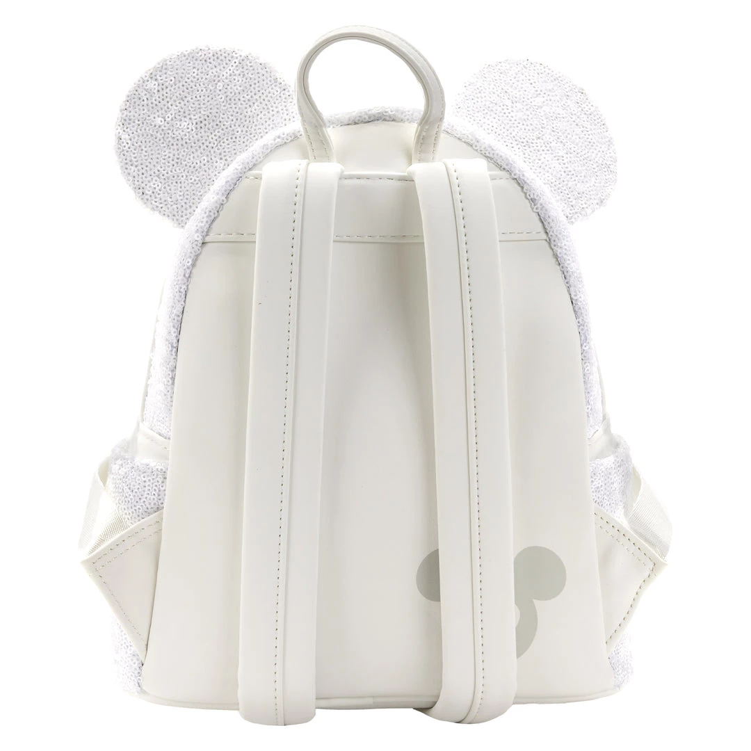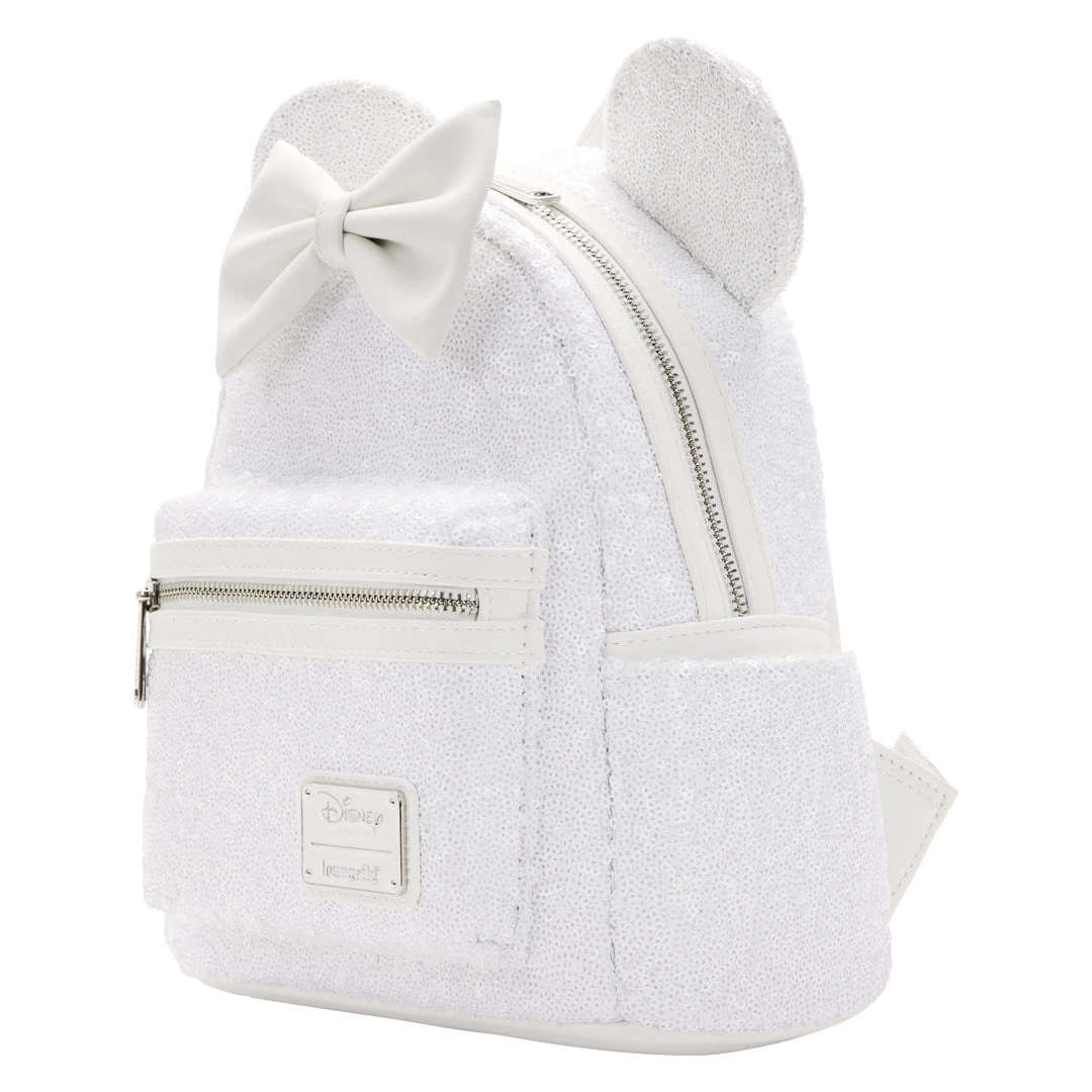 The Loungefly Minnie Mouse Sequin Wedding Mini Backpack is made of vegan leather (polyurethane). Bag has adjustable shoulder straps, sturdy metal hardware and 3D interchangeable bows. Additional features include sequin, applique, debossed, and metal ring details. Take note of the coordinating inside lining.