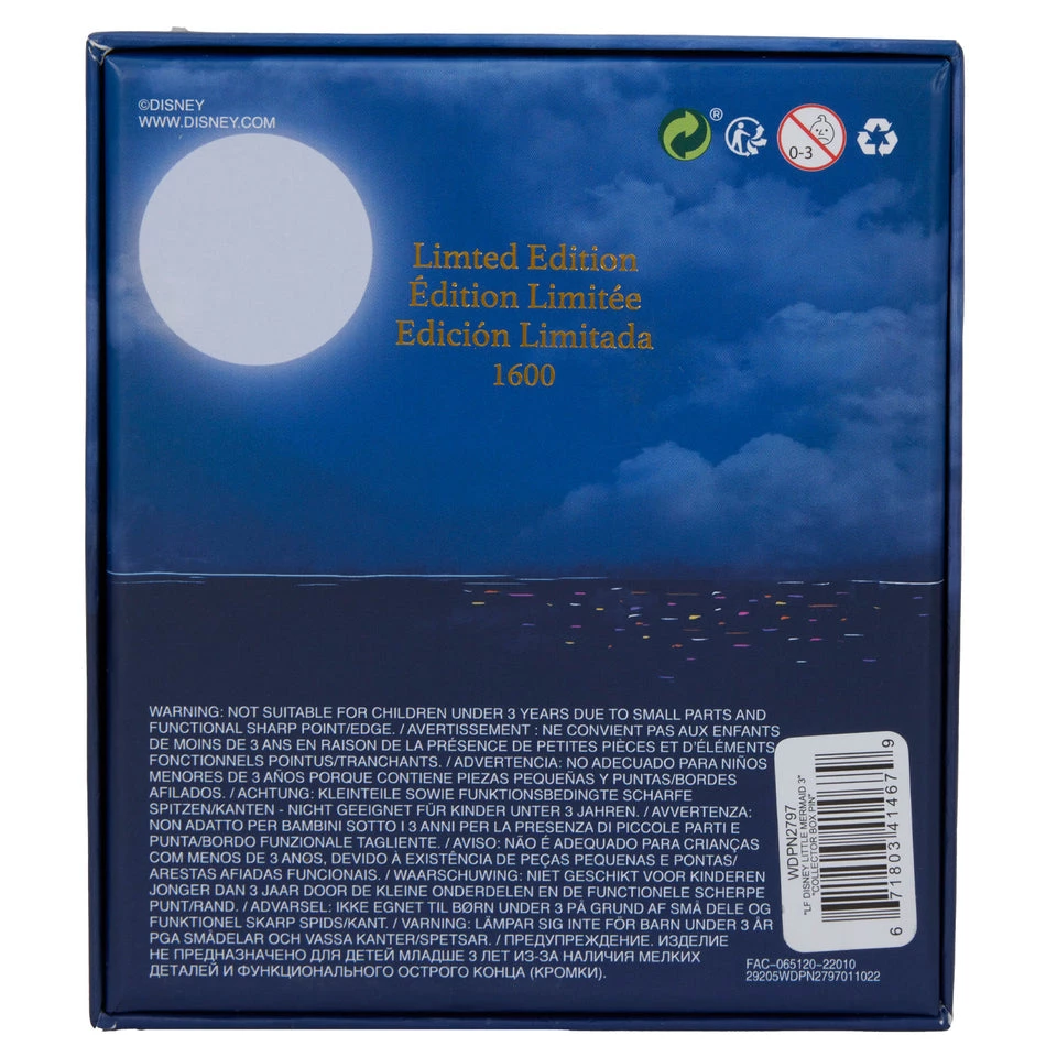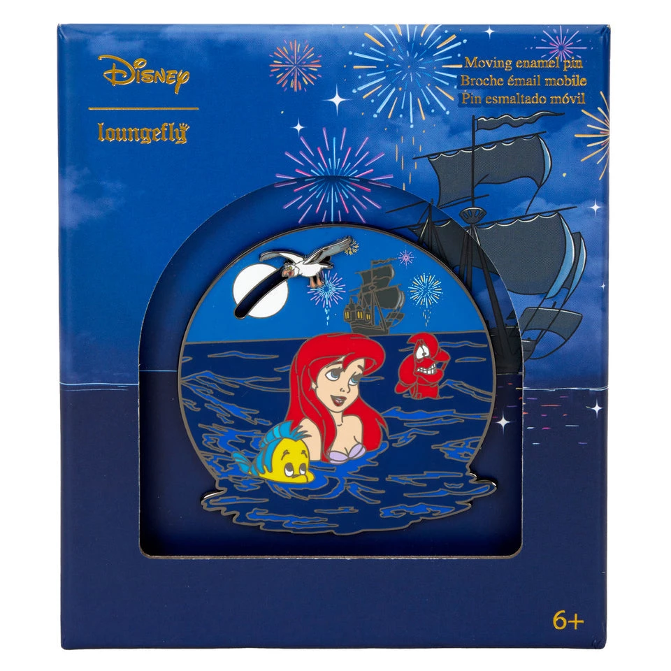 From under the sea, Ariel and her friends have surfaced. Make them a part of your world with this limited-edition Loungefly The Little Mermaid Ariel Fireworks Moving Pin. On the front, Ariel delights in her new discovery: a ship that’s bursting with fireworks for Prince Eric’s birthday. Sebastian senses trouble, while Scuttle swoops down overhead. In fact, Scuttle moves so that he slides to soar over Ariel and Flounder’s heads. This 3-inch pin is a great accent to any Disney outfit, and is the perfect accessory for Disney fans who are looking to keep one of their favorite animated movies close.Â