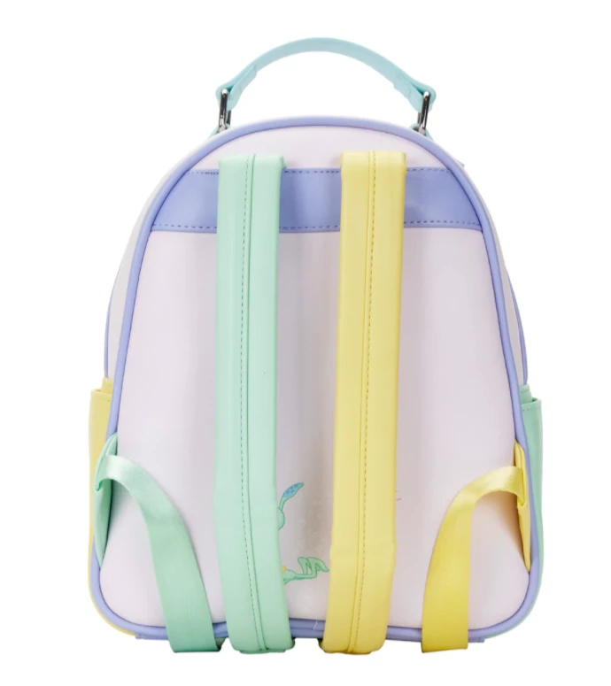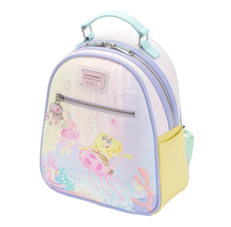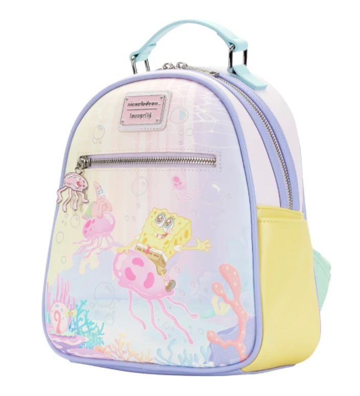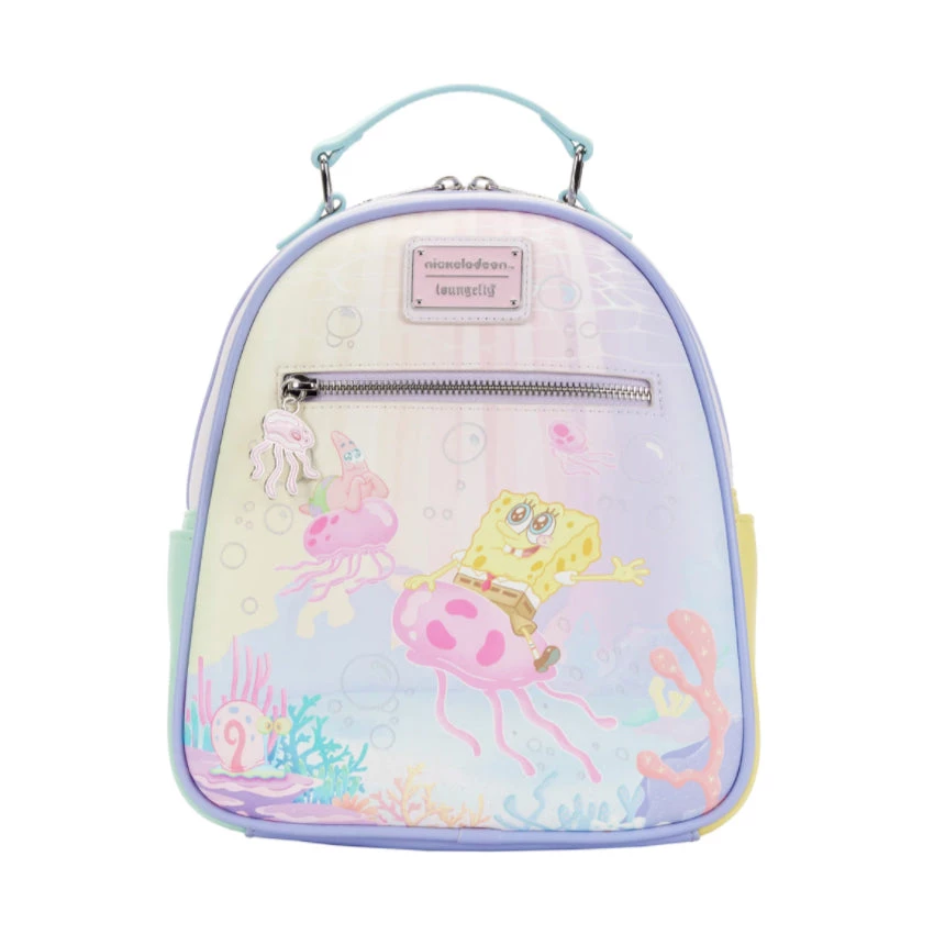 With a la-la-la-la-la, follow SpongeBob to Jellyfish Fields, where jellyfish buzz about, making their jellyfish jelly. Make room for the day’s catch in this SpongeBob SquarePants Jelly Fishing Mini Backpack. On the front, SpongeBob is riding a graceful jellyfish, accompanied by Patrick Star and Gary, in a pastel wonder of coral and iridescent printed bubbles. SpongeBob’s eyes are wide with happiness, as he is in his element. An enamel zipper charm of a jellyfish completes the look. On the back, Squidward runs from a jellyfish that’s about to sting him. Note the coordinating inside lining.