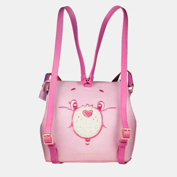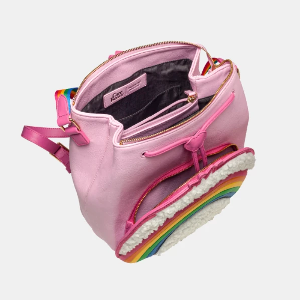 Spread the cheer wherever you go when wearing this joyous shoulder bag that also converts to a backpack! This two-in-one piece showcases different designs on each side. The front of the bag mimics Cheer Bear’s adorable rainbow belly, with an exterior zipper pocket to store your cell phone and essentials. The backside of the bag features the bear’s sweet face with shearling trim. Finished with rainbow shoulder straps, the details on this backpack are sure to bring out a rainbow every day. Inside there are two interior compartments, and a back wall pocket. The backpack straps are adjustable as well to customize the fit.