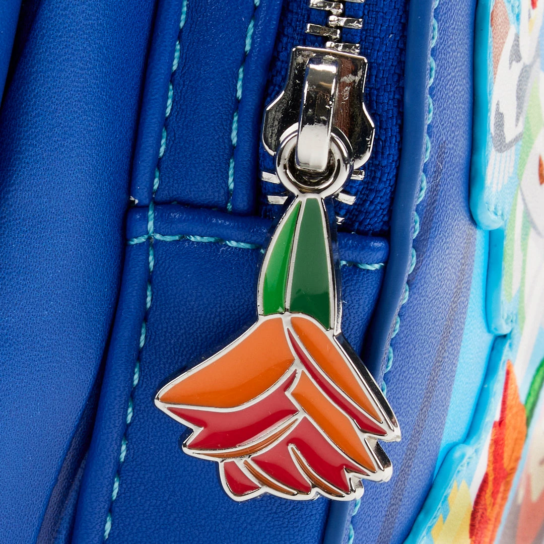 Clear the dance floor and shine a spotlight on Buzz Lightyear and Jessie as they spin and shake their hips to a Flamenco beat! Capture this upbeat moment and keep it close with the Loungefly Disney-Pixar Toy Story Jessie and Buzz Mini Backpack. On the front zipped compartment of this backpack, Buzz dips Jessie who, with dramatic flair, looks up, holding a rose between her teeth. An enamel-fill charm of a rose, over the zipped compartment, completes the scene. Above them, two Toy Story Aliens perch on a boombox while Bullseye looks down over the scene. On one of the side pockets, a printed detail of Woody appears with a rose. On the back, Buzz and Jessie continue to dance, center stage, while Mr. Potato Head, Mrs. Potato Head, the Peas-in-a-Pod, and Dolly form a circle around them. This backpack is the perfect accessory to complement a Disney outfit or turn any outing into a magical adventure.