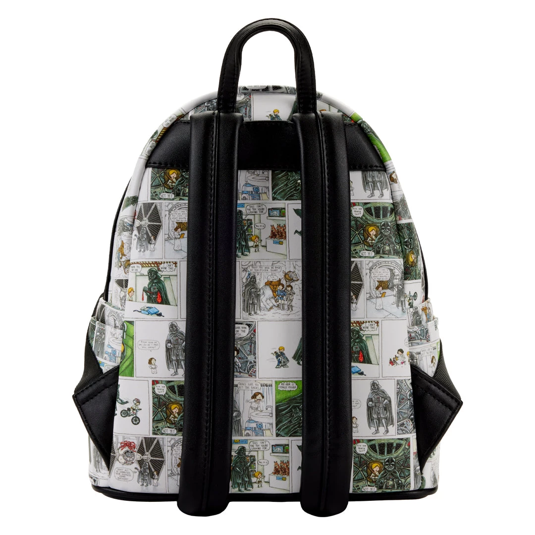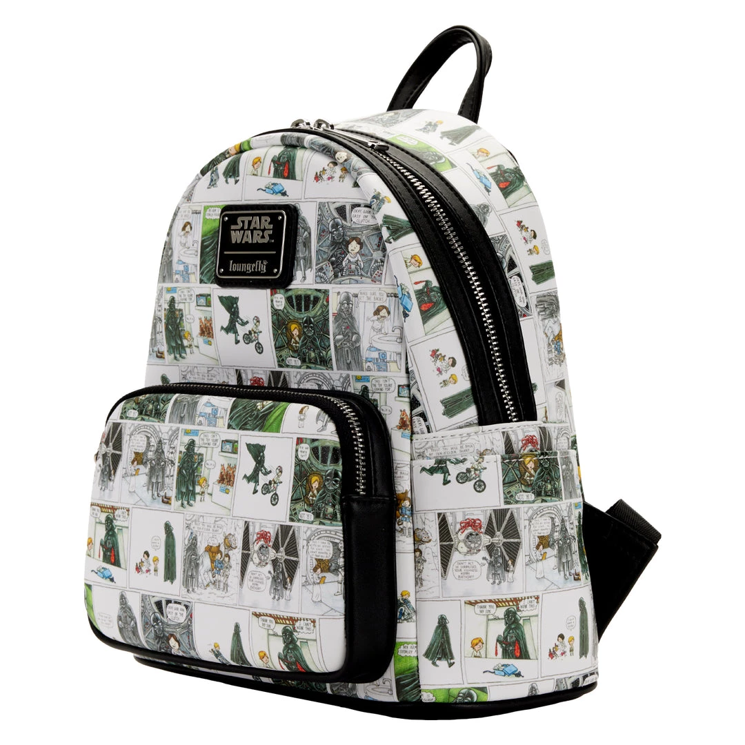 Parenthood is a galactic responsibility. The Loungefly Darth Vader Comic Strip Mini Backpack displays an all-over print of Darth Vader with a young Luke and Leia. Featuring artwork by Jeffery Brown, these comic book-style panels imagine endearing scenarios of Darth Vader as he experiences the everyday challenge of raising two of the galaxy’s finest heroes. Darth Vader’s mask appears as an enamel zipper charm for a dose of added fun. This playful accessory adds a spark of joy to any outfit and is sure to uplift your Star Wars collection.