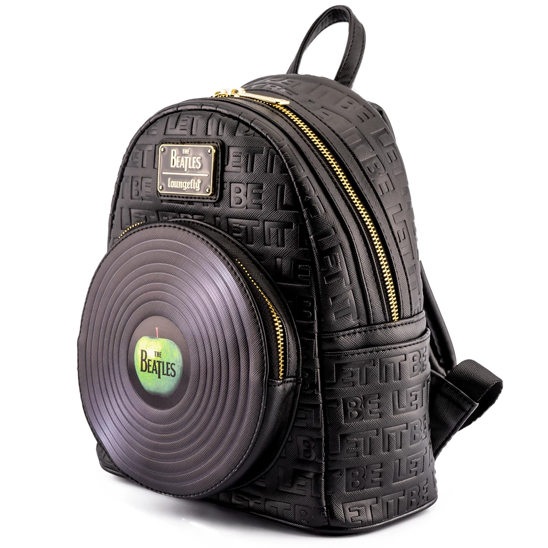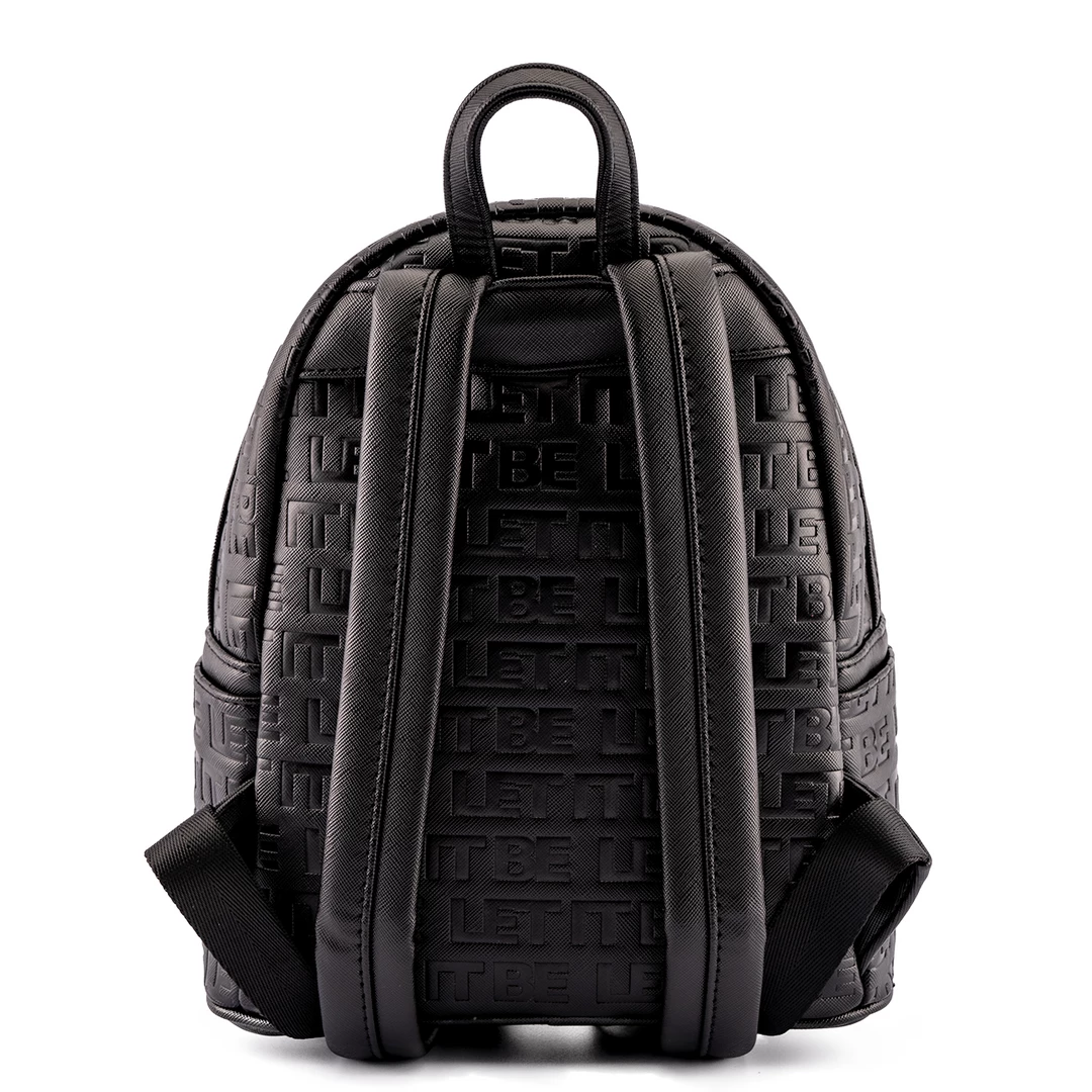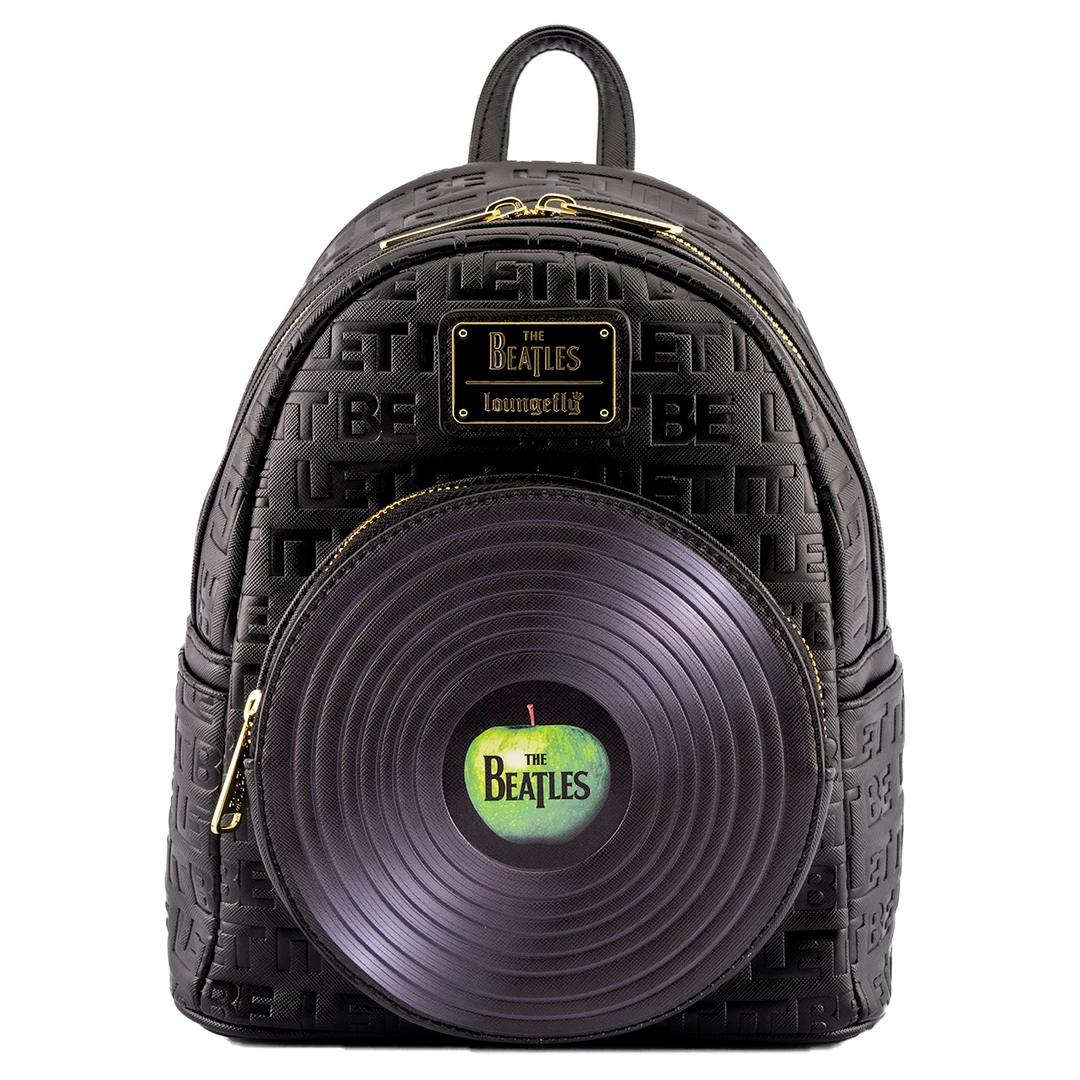 In times of trouble this Loungefly The Beatles Let It Be Vinyl Record Mini Backpack will bring you joy as well as utility. Carry your journey’s necessities and the memories of The Beatles music with this sleek and subtle mini backpack. The front pocket is shaped like a vinyl record, featuring the green apple The Beatles logo. Printed in light relief across the black backpack is “Let It Be” the song that inspired this design.