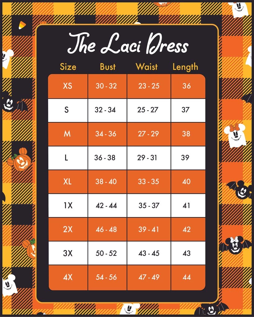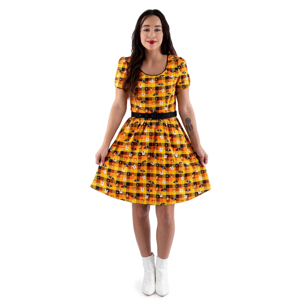 Bring a touch of not so scary Halloween cuteness into your wardrobe by wearing the Disney Stitch Shoppe Spooky Mickey and Minnie Mouse “Laci” Dress. Across this orange, yellow, and black gingham pattern are Mickey Mouse and Minnie Mouse as ghosts, jack-o-lanterns, and jack-o-lantern bats. The neckline has black piping trim and the dress comes with a black belt.